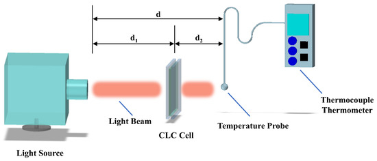 Temperature measurement diagram demonstrating thermal management effect of the single-layer templated CLC cell (d, distance between light source and temperature probe; d1, distance between light source and CLC cell; d2, distance between CLC cell and temperature probe).