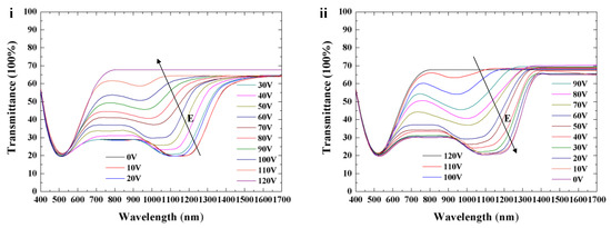Optical characteristics of CLCs with adjustable reflection in the infrared band via increasing (i) and decreasing (ii) electric field (E, electric field).