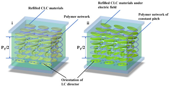 Molecular arrangements of CLC helix driven by electric field. (i) Lying molecules of refilled material and pitch of template without electric field (dashed lines indicate orientation of LC director). (ii) Tilted molecules of refilled material and constant pitch of template in an electric field.