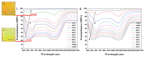 where is the central wavelength of Bragg reflection, is the average refractive index, is the angle between incident light and the normal ( in this work), and are molecular thermodynamic factors, and is the phase transition temperature. For the CLC material used in single-layer cell, the helical pitch increases with the increase in temperature (). At 25 °C, the refilled material exhibits a flat and wide reflection band with a bottom width of 130 nm and full width at half-maximum of 320 nm in the infrared band, owing to the large birefringence of LCs and large cell gap. The center of the reflection band in the visible spectrum shifts little (1~2 nm as shown in Figure 5i) due to the strong interface anchoring energy of the polymer network from the template. The refilled material shows a flexible thermal response in the infrared, owing to little limitation from the polymer network, as shown in Figure 6. As temperature increases, the reflection band red shifts from 950 nm to 1305 nm (infrared region (>1000 nm), which irradiates a large amount of heat). The cell would be beneficial to the thermal management of buildings if applied in smart windows. Simultaneously, the cell showed a color in the visible region (at a central wavelength of 530 nm) induced by the template. As shown in Figure 5ii, the shift in the infrared band can be reversibly driven via heating and cooling.