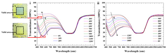 The spectral properties of Cell-3 as a function of the electric field were also investigated. Figure 12i shows a continuous blue shift from 530 nm to 440 nm with an increase in voltage from 0 V to 110 V. Transmission spectra in the infrared band of the template change little, owing to the strong anchoring force from the polymer network. The transmittance of the reflection band in the visible spectrum gradually decreases until the LC molecules orient perpendicular to the glass substrate. The central wavelength can be adjusted reversibly via electrical actuation, as illustrated in Figure 12. The electric-field-induced color change of Cell-3 in the original state (inset image (a) in Figure 12i) and in the electric field (inset image (b) in Figure 12i) was recorded. Initially, Cell-3 exhibited a greenish color without the influence of an external field. When an electric field was applied on Cell-3, the valid central square area showed a blue-colored reflection due to the rotation of LC directors induced by the electric field.