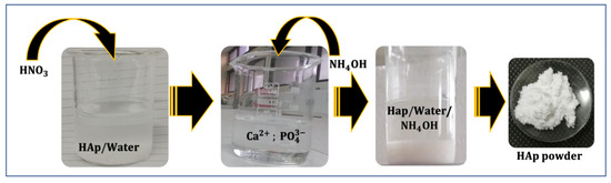 The synthesis method utilized was the dissolution/precipitation of HAp (Figure 1). This involved dissolving 1 g of HAp powder in 50 mL of distilled water (prepared as described by [39]), followed by acidification with HNO3 to break down the apatitic network (dissolution). The pH of the solution was then raised to 9 by adding NH4OH, which resulted in the re-precipitation of nanometric-sized crystals of HAp.