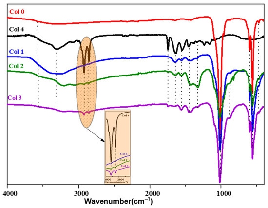 ATR-FTIR spectra of hydroxyapatite (Col 0), collagen type I (Col 4), and hydroxyapatite/collagen/composites (Col 1, Col 2, and Col 3).