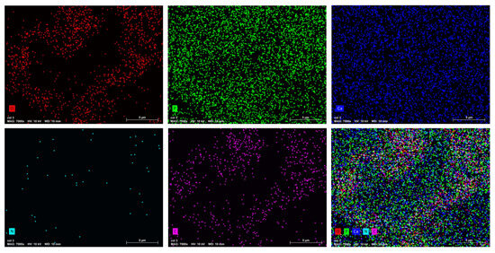 XRD-EDX was used to investigate the crystal structure and the elemental composition of the composites. The XRD patterns were recorded using a Panalytical X’Pert Pro instrument (Malvern Panalytical GmbH, Kassel, Germany) with a Cu Kα radiation source at 40 kV and 30 mA, and a scan rate of 2 °/min. The EDX spectra were obtained using an attached detector on the same instrument.