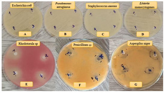 Antibacterial (A–D) and antifungal (E–G) effects of samples on different bacteria and fungi strains.
