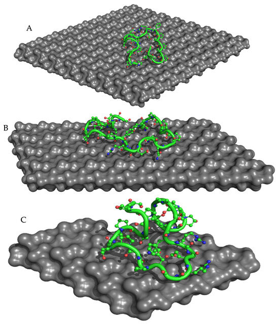 ADVina-predicted interaction between collagen type 1 and the HAp molecule for the Col 1 (A), Col 2 (B), and Col 3 (C) complexes. The protein molecule is presented in both cartoon and ball-and-stick representations, with colors corresponding to its atomic composition. For clarity purposes, all hydrogen atoms are omitted from the visualization.