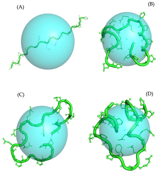 Calculated radius of gyration (Rg) for Ref (A), Col 1 (B), Col 2 (C), and Col 3 (D) conformations of collagen type 1. The Rg parameter is visualized as a sphere with the center corresponding to the center of mass of the molecule. The protein molecule is presented in both cartoon and ball-and-stick representations, colored in green. For clarity purposes, all hydrogen atoms are omitted from the visualization.