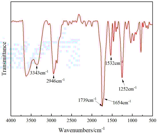 The stretching vibration absorption peak of –NH– and –OH is at 3343 cm−1 in Figure 1. The characteristic absorption peak of –CH3 and –CH2– is at 2946 cm−1, the stretching vibration absorption peak of carbonyl group is at 1739 cm−1, and the absorption peak of C=C is at 1651 cm−1. It was established that to maximize the degree of crosslinking, the chemical bonding between HEMA and prepolymer was crucial to the synthesis of CWPU. Additionally, there is no absorption peak between 2000 and 2500 cm−1, which further suggests that the –NCO reaction is complete and results in the formation of the carbamate structure. The distinctive absorption peak of N–H in –CONH has a wave number at 1532 cm−1.