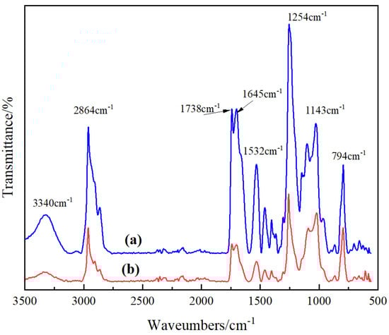 The curves (a) and (b) of Figure 2 depict the stretching vibration peaks of –NH– and –OH at 3340 cm−1, the methyl-methyl absorption peak at about 2910 cm−1 and 2864 cm−1, and the absence of any absorption peaks between 2000 and 2500 cm−1. It was demonstrated that throughout the synthesis process, –NCO underwent complete reactivity and changed into a carbamate structure. The carbonyl group has a stretching vibration peak at 1738 cm−1, a double bond has a characteristic absorption peak at 1645 cm−1, and N–H in –CONH has a characteristic absorption peak at 1532 cm−1, 1462 cm−1, and 1245 cm−1. The curve also reveals the deformation absorption peak of CF2 at 696 cm−1, the stretching vibration absorption peak of C–F at 1143 cm−1, the stretching vibration absorption peak of CF3 at 846 cm−1, and the absorption peak of CF3 at 794 cm−1, all of which signify the inclusion of fluorine in fluorinated polyurethane. Additionally, it can be seen from a comparison of curves (a) and (b) in Figure 2 that there is a variation in the strength of the same band peak when the PA/PU ratio is 50/50 and 30/70. The height of the 30/70 peak can be clearly seen to be higher than the 50/50 peak among them at 1738 cm−1 and 1532 cm−1, demonstrating that when PA/PU is 30/70, the absorption peak of the carbonyl group and carbamate bond is rather strong. Moreover, the absorption peak of 50/50 is stronger than that of 30/70 at 1143 cm−1 and 794 cm−1, further supporting the idea that when PA/PU is 50/50, the proportion of fluorine-containing acrylate increases, increasing the strength of the C–F and CF3 stretching vibration peak. This also further confirms the core-shell structure of the self-encapsulation behavior.