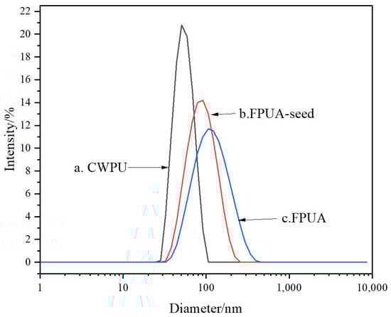 Figure 3 shows that the particle size distributions of the CWPU and 30 wt% and 50 wt% FPUA emulsions are unimodal, indicating that the physicochemical distributions of the emulsions are fairly uniform. Among all the emulsions, PU has the smallest particle size and the narrowest particle size distribution, which indicates that the latex particles have good storage stability. Secondly, the modified 30 wt% FPUA emulsion had smaller particles and a narrower distribution compared to the 50 wt% FPUA emulsion. The amphiphilic CWPUs were self-assembled to form aggregates, which were surrounded by ionizable groups produced by the MDEA units. Relatively large aggregates were observed in FWPU-Seed solutions containing CWPU and one-third of the monomer. Considering the lack of hydrophilic portion of MMA and DFMA, it is assumed that these monomers migrate into the CWPU aggregates to reach a steady state and thus are responsible for the formation of larger aggregates. Water-soluble crosslinked DAAMs are dispersed on the surface of the polymer particles after polymerization to form chemical bonds and are susceptible to crosslinking during curing. In FWPU solutions containing CWPU and all monomers, the particle diameter further increases to nearly 100 nm.