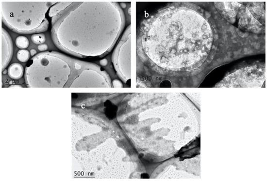 The TEM photograph of FPUA composite. (a) size of 2 μm; (b) size of 500 nm; (c) size of 500 nm.