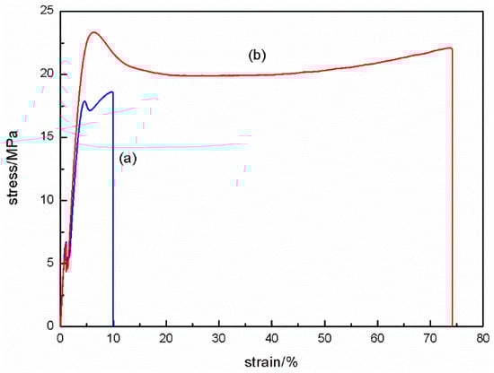 The tensile stress–strain curve of FPUA. (a) PA/PU = 50/50; (b) PA/PU = 30/70.