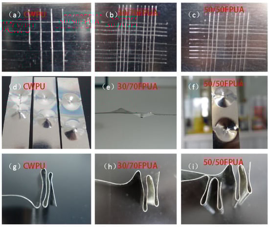 Adhesion (a–c), impact (d–f), and flexibility (g–i) tests of FPUA film.