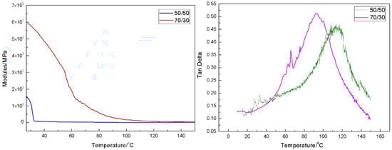 Figure 7 demonstrates the relationship between mechanical loss (tan δ), energy storage modulus, and temperature for a cured FPUA film. Tan δ is a measure of the energy dissipation in a material under cyclic loading and its maximum value corresponds to the glass transition temperature (Tg) of the polymer. Tg represents the temperature at which the polymer transitions from a glassy state to a rubbery or viscous state. The modulus at Tg + 60 °C provides information about the cross-linking density of the film. Cross-linking density refers to the number of chemical bonds formed between polymer chains, which affects the stiffness and rigidity of the material. In this case, the cross-linking density and stiffness are directly related to both Tg and the modulus of the cross-linked polymer. Table S4 presents crucial data obtained from these calculations, specifically comparing the cross-linking densities of two different FPUA films: 50/50FPUA and 30/70FPUA. The results indicate that the cross-linking density of the 30/70FPUA film is significantly higher than that of the 50/50FPUA film, suggesting that the former film is more rigid. However, it is interesting to note that there are no significant differences in Tg and modulus between the 50/50FPUA and 30/70FPUA films in the glassy state. This implies that while the cross-linking density influences the rigidity of the films, it does not have a significant impact on their glass transition behavior. Therefore, the core-shell structure in this case manifests through variations in cross-linking density, which in turn affects the mechanical properties such as stiffness. The glass transition temperature and modulus serve as important parameters for understanding the behavior of these cross-linked polymer films.