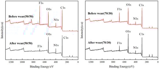Before and after wearing, the surface elements of the polished FPUA films with two core-shell ratios were investigated. As illustrated in Figure 8, the primary constituents on the surface of films are C, N, O, and F. Fluorine elements are more likely to migrate and enrich at the film/air surface following high-temperature heat treatment because their signal intensity is higher before grinding than after. Since the surface of the film is destroyed during grinding, the fluorine content decreases. Furthermore, comparing Figure 8, it can be shown that the enrichment of fluorine on the surface of the FPUA film is lower when the PA/PU ratio is 30/70 than when the PA/PU ratio is 50/50. Table S5 illustrates this quantitative growth more clearly.