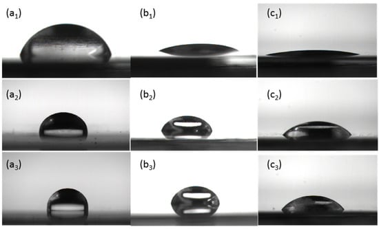 Images of droplets and the contact angles of water (a1–a3), diiodomethane (b1–b3), and hexadecane (c1–c3) on the coating.