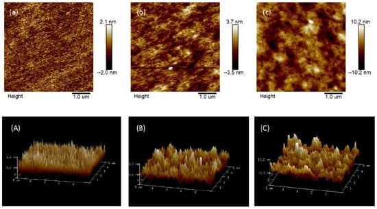 The AFM of CWPU/FPUA films. (a–c) CWPU/30 wt%/50 wt% FPUA; (A–C) CWPU/30 wt%/50 wt% FPUA.