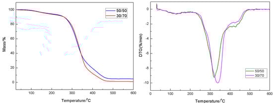 The TGA curves of FPUA-coated films in nitrogen and their thermogravimetric analyses (DTG) are shown in Figure 11, respectively. The residual carbon content (Yc) and the temperature of maximum loss rate (Tmax) of the samples after 600 °C are shown in Table S7. The thermal decomposition temperatures of the polymers do not differ significantly at the initial stage and at 20% weight loss, the decomposition temperatures of the two are comparable, even the decomposition temperature of 50/50FPUA is slightly lower than that of 30/70FPUA, which may be attributed to the poor thermal stability of the MMA chain segments. The subsequent decomposition process can be divided into two main stages, corresponding to the thermal decomposition of the soft and hard phases of the polymer. The decomposition temperature of the hard phase of 50/50FPUA is 254 °C (the C–N bonding energy of the hard phase is low) and the decomposition end temperature is 393 °C, with the maximum decomposition rate occurring at 320.1 °C, while the initial decomposition temperature of the soft phase is 410 °C and the decomposition end temperature is 475 °C. The decomposition stages of the soft and hard phases of 30/70 are not much different from those of 50/50FPUA but the maximum decomposition rate is greater than that of 30/70FPUA and the maximum decomposition rate is higher than that of 50/70FPUA, which is more obvious. The decomposition stage of the 30/70 soft and hard phases is similar to that of the 30/70 phase but the maximum decomposition rate is greater than that of the 50/50 FPUA, which shows that the heat resistance of FPUA increases with the increase in the proportion of FPA. This is because the addition of fluorinated monomers further improves the heat resistance of the coating film due to the larger bond energy and higher stability of the C–F bond. The higher the DFMA content in the shell layer in the core-shell structure, the higher the C–F bond binding energy, the more stable the structure, and the better the heat resistance.
