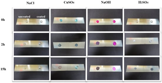 The bulk of the uncoated tinplates have corroded to discoloration because of a chemical reaction between the solution on their surface and the iron sheet substrate, as seen in Figure 12. The tinplate surface coated with FPUA emulsion, however, still maintains high surface integrity and very little corrosion after 15 h of acid–alkali salt corrosion. This demonstrates that the modified FPUA film has good corrosion resistance and can withstand the interference of a harsh external environment.
