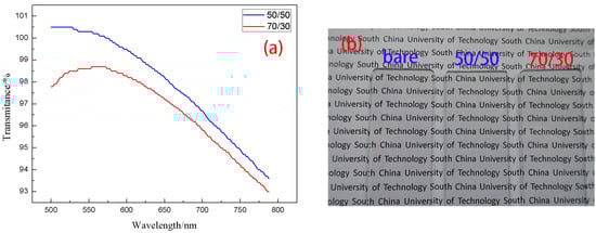 Transmittance test of FPUA film. (a) Transmittance Curve; (b) Corresponding coatings are tested for transparency.