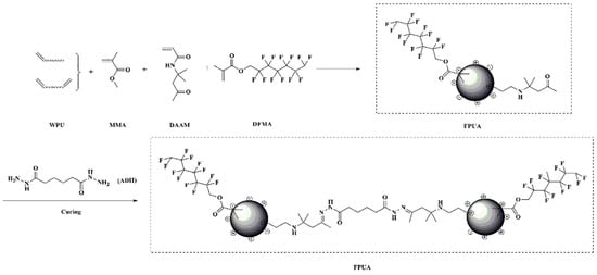 2.3. Preparation of Fluorinated Waterborne Polyurethane-Acrylate Core-Shell Emulsion (FPUA)