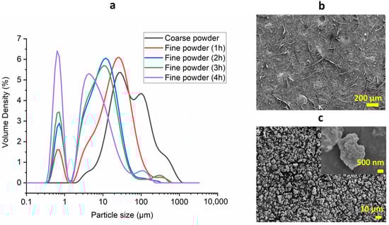 Figure 1a shows the particle size allocation of the GM powders at the different stages of milling. GM coarse powder showed two major powder size distributions, probably due to the presence of two distinct natures of the particles, one coming from the cotton fibres and one from the wooden fractions in GM. This was also consequenced in the GM slurries from 1 h to 4 h milling as two normal size distributions were seen. Table 2 shows the particle size of GM powders achieved after rotary cutting and attritor milling (1 to 4 h). The values of d(10), d(50) and d(90) represent the sizes of 10%, 50% and 90% of the powders that were lower than the listed size, respectively. The first hour of attritor milling reduced the d(50) by around 57.4% (from approx. 46 μm to 20 μm) via the continuous beating of the GM powder using the ceramic balls during the process. With the increase in attrition time, the d(50) reached 4.37 μm after 4 h. The time of attrition was optimised at 4 h as further attrition time resulted in minimum changes in the particle size [25]. The benefit of having a longer duration of attrition is usually to enhance the uniformity of particle shape. The morphology of GM coarse powder (Figure 1b) showed a mixture of fibres and randomly shaped particles related to the contents in GM. Powders showed non-spherical random shapes after the 4 h attrition, as shown in Figure 2c, due to the further breakdown of the GM coarse powders into a much smaller size.