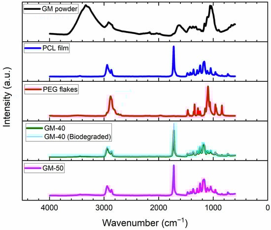 FTIR spectra of GM powder, PCL film, PEG flakes, GM-50 and GM-40 films, and GM-40 film after biodegradation.