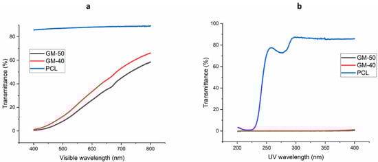Transmission spectra of PCL, GM-50 and GM-40 composite films in (a) visible wavelength and (b) UV wavelength.