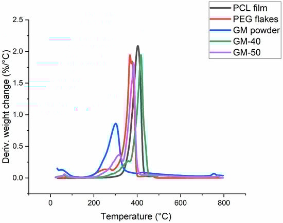 The DTG curves for GM powder, PCL film, PEG flakes, GM-50 and GM-40 composite films are shown in Figure 7. The temperatures at which 10% and 50% of weight loss occurred in each sample are also listed in Table 3. For GM powder, loss of weight from 30 °C to 100 °C was mainly from moisture evaporation, whereas the degradation of powder started around 210 °C as its main content was cellulose [29]. The degradation of PEG started near 183 °C and a 97% loss of weight occurred at 399 °C, whereas the degradation of PCL started near 290 °C and a 97% loss of weight was seen at 442 °C. None of the polymers existed at 500 °C due to complete degradation. The GM-50 composite film started degradation from nearly 214 °C and lost 50% weight at 370 °C, though it maintained nearly 10% weight from 463 °C to 500 °C. The GM-40 composite film started degradation from near 224 °C and lost 50% weight at 410 °C, but it maintained a 10% weight from 444 °C. Both the composites maintained a similar weight (~10%) at 500 °C, indicating that the difference in GM content was not significant enough to influence the overall thermal stability. Both the composite films did not completely degrade at 500 °C, which aligns with the data of pure GM (20% weight maintained at 500 °C) and is associated with the higher thermal stability of lignin [1].