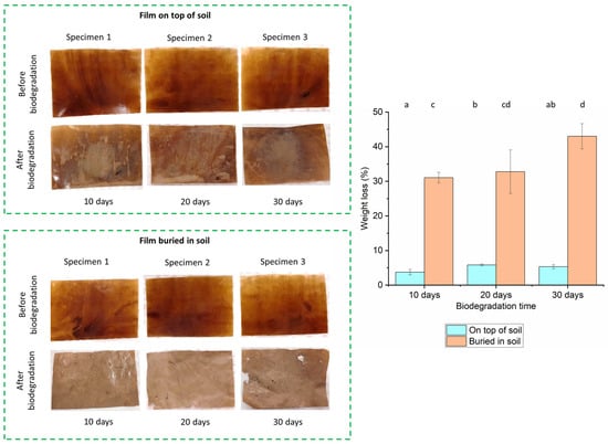 The physical changes in GM-40 composite films before and after soil degradation and weight loss (%) during biodegradation. Different alphabets indicate data that are significantly different (p ≤ 0.05) from each other.