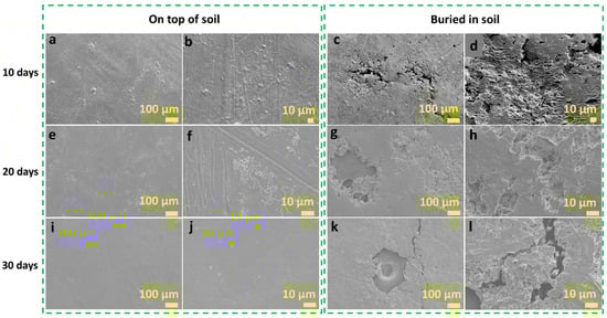 SEM images of GM-40 composite film surface after biodegradation (on top of the soil and while buried in soil): (a–d) after 10 days, (e–h) after 20 days and (i–l) after 30 days.