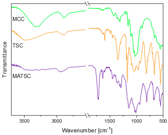 FTIR spectra of MCC, TSC and MATSC. The spectra are shifted vertically for better readability.