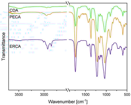 The comparative FTIR characterization of the CDA and its photocrosslinkable derivatives 4-pentenoic CDA (PECA) and erucic CDA (ERCA) confirmed the successful esterification of the CDA with unsaturated carboxylic acids (Figure 3). PECA and ERCA were selected for detailed discussion because 4-pentenoic acid is short-chain and has a terminal carbon double bond while erucic acid is a long-chain fatty acid and exhibits a non-terminal carbon double bond. The educt CDA revealed a strong absorption band at 1738 cm−1, which was assigned to the carbonyl C=O ester stretching vibration [11,12,30]. Furthermore, significant vibrations of the CDA appeared at 1367 cm−1 and 1217 cm−1, corresponding to the methyl in-plane bending vibration and the C–O stretching vibration of the acetyl group, respectively [11,12,30]. After the functionalization of the CDA with 4-pentenoic acid, new absorption bands arose at 3084 cm−1, 1643 cm−1 and 758 cm−1, referring to the =CH2 stretching vibration, the alkene C=C stretching vibration and the =CH2 out-of-plane deformation vibration [11,38]. Accordingly, the modification of CDA with erucic acid resulted in additional absorption bands located at 3011 cm−1, 2924 cm−1, 2854 cm−1, 1651 cm−1, 953 cm−1, 878 cm−1 and 722 cm−1. The band at 3011 cm−1 was assigned to the =C–H stretching vibration of the carbon double bond of the unsaturated fatty erucic acid [39]. The distinctive absorption bands that appeared at 2924 cm−1 and 2854 cm−1 corresponded to the asymmetrical and symmetrical stretching of the aliphatic CH2 groups [39]. Moreover, the bands located at 1651 cm−1, 953 cm−1, 878 cm−1 and 722 cm−1 referred to the C=C stretching vibration and the –HC=CH– out-of-plane vibration of the erucic side group, respectively [39]. For both PECA and ERCA, the band for the C=O ester of the olefinic side group was not directly visible, since the absorption band of the acetyl ester, at around 1738 cm−1, overlapped with them.