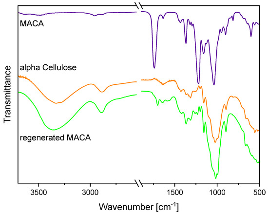 FTIR spectra of MACA, regenerated MACA and alpha cellulose. The spectra are shifted vertically for better readability.