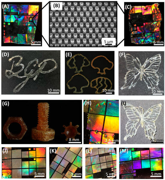 Architectures manufactured with cellulose-based photoresists. (A) Casted film (generated with methacrylated CDA) with an imprinted diffraction pattern that produced brilliant coloration when irradiated with white light. (B) The SEM image of the pattern, which consists of regularly aligned pillars in the micrometer range. (C) The pattern structure still revealed brilliant coloration after the film was regenerated into cellulose with sodium methoxide treatment, indicating that the macrostructure of the cellulose-based device was not significantly affected by the reconversion process. (D) A BGP logo made from the cellulose derivative MACA, written by hand with a pipette. (E) Various shapes of trees manually printed using the derivative MACA (according to the synthesis described in [12], which caused the yellowish to brownish coloration of the biopolymer). Each tree consists of five individual layers that were UV-cured before the next layer was printed. (F) A butterfly structure printed with the biopolymer MACA. (G) Various bulky parts, a nut, a screw and a gear, fabricated using layer-by-layer casting of the derivative MACA [12] into a PDMS mold. Each layer was photocrosslinked for 15 min. (H) Same as (A), but produced with a methacrylated TSC derivative. (I) A butterfly structure generated from MACA and entirely converted into cellulose with sodium methoxide. (J–M) Several casted films with imprinted diffraction patterns, produced by the photocrosslinking of various cellulose derivatives such as (J) oleic CDA, (K) linoleic CDA, (L) 4-pentenoic CDA and (M) sorbic CDA.