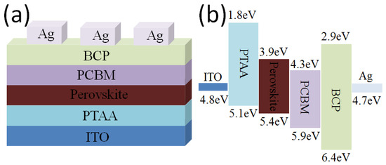 Considering that perovskite thin films are highly sensitive to oxygen, moisture, heat, ultraviolet light, and light soaking [33,34,35], the preparation of each functional layer of the PHJ-PSCs, including the electron/hole transport layers and passivation layer, was performed layer by layer through a solution process method in a nitrogen-filled glove box. Figure 1a illustrates the device structure of the PSCs, i.e., glass/ITO/PTAA/perovskite/PCBM/BCP/Ag, where the perovskite active layer was sandwiched between the hole and electron transport layers. The cathode of the PSC was completed by evaporating metal silver in a vacuum environment. The energy level of each functional layer is depicted in Figure 1b. It is evident that the energy level of PTAA matches that of the perovskite layer, creating effective hole contact that blocks electron extraction due to the shallow conduction band. Furthermore, due to its deep valence band, PCBM also serves as an excellent electron transport layer.