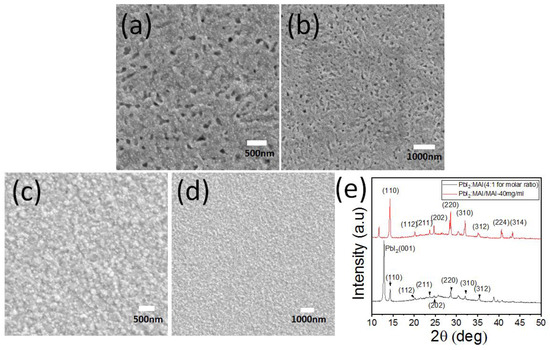 SEM at different magnifications of PbI2 (a,b) and CH3NH3PbI3 (c,d) perovskite thin films. (e) XRD images of CH3NH3PbI3 and compound perovskite thin films.