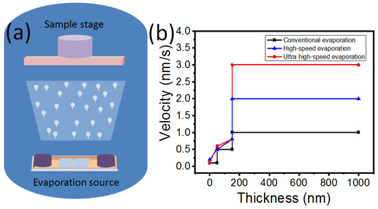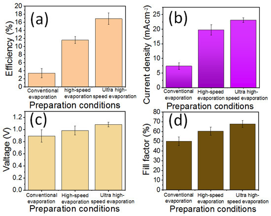 Figure 3 depicts a schematic diagram of the evaporator and the evaporation method of the metal electrode, respectively. The evaporator consisted of a metal chamber, an evaporator boat, a molecular pump, a mechanical pump, and a sample stage. To prepare the metal electrodes of PSCs, the metal material was first placed on the evaporator boat, and the heat for evaporation was derived from the heating current. As the heat increased, the metal materials were transformed into a molten state. The molten metal then became a metal vapor and adhered to the surface of the BCP-coated ITO substrate. To ensure good contact between the metal electrode and the BCP passivation layer, air was removed from the metal chamber using mechanical and molecular pumps. The evaporation of the metal electrode can only occur when the pressure of the air in the metal chamber is below 8 × 10−4 Pascals. In this work, the metal chamber of the evaporation instrument was half the size of those used in other laboratories. Three preparation strategies, namely a conventional evaporation rate, high-speed evaporation rate, and ultra-high-speed evaporation rate, were adopted to achieve high-quality metal electrodes for PSCs. The detailed preparation process is shown in Figure 3b. As the thickness of the metal electron increased, the evaporate rate also increased. When the thickness of the metal electrode was below 50 nm, all three methods had rates below 0.6 nm/s. As the thickness of the metal electrode reached around 150 nm, the evaporation rate of the three evaporation methods steadily increased to 0.8 nm/s. However, when the thickness exceeded 180 nm, the conventional evaporation method had a rate of 1 nm, the high-speed evaporation method had a rate of 2 nm/s, and, for the ultra-high-speed evaporation method, it was 3 nm/s. During the process of electrode deposition, the thickness ranged from 200 to 1000 nm, with the evaporation rates of conventional evaporation, high-speed evaporation, and ultra-high-speed evaporation being 1, 2, and 3 nm/s, respectively. It is evident that the ultra-high-speed evaporation rate is three times faster than the conventional evaporation rate, which is beneficial for industrialization in the future.