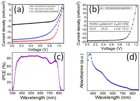 Figure 4a displays the typical photovoltaic data of PHJ-PSC devices. The Voc of the PSC devices varies under different deposition conditions: 0.99 V for conventional evaporation, 1.03 V for high-speed evaporation, and 1.04 V for ultra-high-speed evaporation. The short-circuit current densities (Jsc) are 8.45, 21.89, and 23.48 mA/cm2, respectively. The filling factors (FF) of the three methods sequentially change from small (54.99%) to large (56.00%) and then to the maximum (72.90%). This leads to a similar change in the power conversion efficiency (PCE), which changes from 4.60% to 12.59% and then reaches the maximum value of 17.51%. Notably, the comprehensive factor of ultra-high-speed evaporation is higher than that of conventional evaporation. Figure 4b shows the Jsc versus voltage characteristics of the best PSCs, with a Voc of 1.13 V, Jsc of 23.21 mA/cm2, and FF of 73.11%, yielding the maximum PCE of 19.21%. Additionally, Figure 4c displays the IPCE spectrum of the corresponding PHJ-PSC devices, while Figure 4d shows the absorbance spectrum of the CH3NH3PbI3 perovskite film. The IPCE data illustrate a favorable spectral response in the range of 300–850 nm, which aligns with the absorbance of the CH3NH3PbI3 perovskite film in Figure 4d.