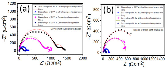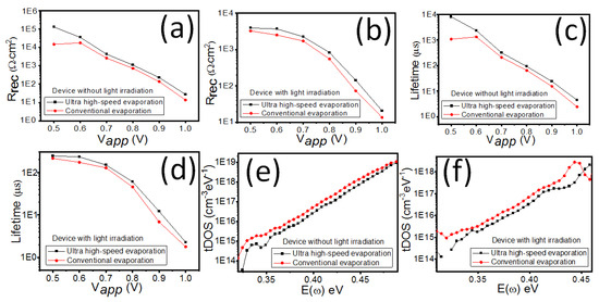 Electrochemical impedance is a highly effective tool in analyzing carrier dynamics and is widely used in organic solar cells and lithium-ion batteries [36,37,38]. It also enables a deeper understanding of the physical and chemical properties of PHJ-PSC devices [39,40]. Figure 6a,b display the typical impedance spectra (IS) of PHJ-PSCs measured under different bias voltages (0.8 V or 0.9 V), without and with light irradiation conditions. The bias voltages of 0.8 and 0.9 V are very close to the Voc of the PSCs, making them beneficial for reflecting on the working status of the solar cell. Therefore, only IS data with bias voltages of 0.8 and 0.9 V were collected. Notably, the presence of two distinct semicircles is observed for devices with light irradiation conditions, while only one semicircle is present for devices without light irradiation conditions. This suggests different transport processes in the PSCs at different frequencies. To extract valuable information, such as the carrier recombination resistance, carrier recombination lifetime, and defect state, the fitted curves of IS data are analyzed for PHJ-PSC devices with and without light irradiation conditions (Figure 7a,f). Importantly, regardless of the light irradiation condition, the recombination resistance for PHJ-PSCs with metal electrodes prepared by ultra-high-speed evaporation is higher than that of PHJ-PSCs with metal electrodes. This indicates that there is less electron-hole pair recombination in PSCs with ultra-high-speed evaporation, implying improved device performance. Additionally, the recombination lifetimes for PHJ-PSCs with metal electrodes prepared by ultra-high-speed evaporation are longer compared to those with metal electrodes prepared by conventional evaporation, regardless of the light irradiation condition. This finding aligns with the results of the recombination resistance. The defect state in PSCs significantly influences device performance. The trap density of states (tDOS) in PSCs can be calculated using the following formula [41,42].