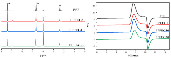 The 1H NMR hydrogen spectra of PPFEG copolymers also retained the characteristic peaks of PPF and PEG, and the characteristic peak areas of the PEG chain segments increased exponentially with increasing PEG content. The above structures indicate that PPFEG copolymers were successfully synthesized. As shown in Table 1, PPF and PPF copolymers were successfully synthesized with relatively large molecular weights, and their molecular weight distribution did not vary significantly.