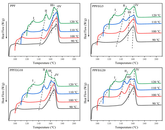 In Figure 4, Ⅰ is the annealing peak, and I, III, and Ⅳ are the melting peaks from lower to higher temperatures. The reasons for these multiple melting behaviors are complex. Ⅱ and III are mainly related to the melting behavior of β-crystals, where Ⅱ increases with increasing Tc and Ⅲ barely shifts with increasing Tc. This can be explained by the melting–recrystallization –remelting theory because imperfect β-crystals formed at higher Tc are more stable and have a shift in melting point towards higher temperatures, whereas, for the melting peak, Ⅲ of the perfect β-crystals formed by recrystallization does not change with increasing Tc, a phenomenon similar to that reported by Chen [22]. Due to the restricted interval of melt recrystallization of PPF and PPFEG copolymer cool due to increasing Tc, the intensity of all polyester Ⅲ decreases continuously and eventually overlaps with the progressively higher temperature shifted Ⅱ or higher temperature Ⅳ figure and disappears.