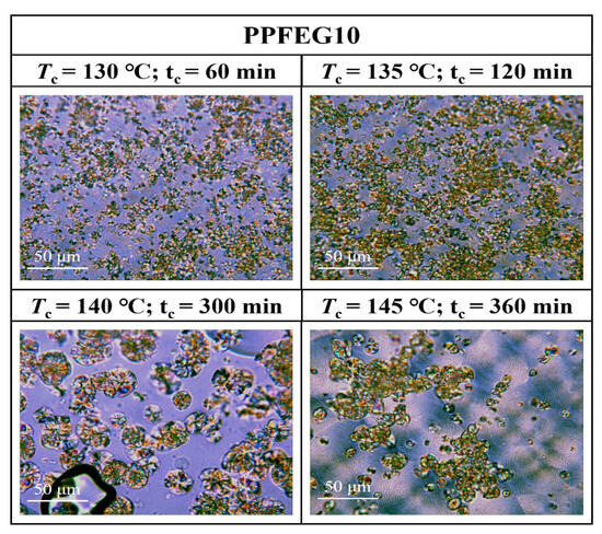 Figure 7, Figure 8, Figure 9 and Figure 10 show the spherical crystal morphologies of the PPF and PPFEG at different Tcs values and crystallization times. The results showed that the spherical crystal size of PPF and PPFEG increased, and the nucleation density decreased as the Tc increased. Because the Tm of PPFEG decreased significantly with increasing the proportion of PEG chain segments, which led to a decrease in the degree of supercooling, the nucleation density decreased significantly with increasing PEG chain segments, and the size of spherical crystals became larger at the same Tc.
