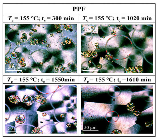 Morphological transition from globular-free crystals to annular spherical crystals is a common phenomenon in the crystallization of polymers. Represented by the red circles in Figure 11, Figure 12 and Figure 13 are special cyclic ring-banded spherical crystals. Ring–shaped spherulites are shown in Figure 11, Figure 12 and Figure 13. From Figure 10, it can be seen that the PPF at a crystallization temperature of 155 °C slowly increases with increasing crystallization time, with the grain boundaries extending outwards. At a crystallization temperature of 155 °C, PPF starts with no special ring–like ring–banded spherical crystals at the beginning, but as the crystallization time increases, PPF starts to show special ring-like ring-banded spherical crystals. Because of the subcooling degree, we analysed the change in spherical.