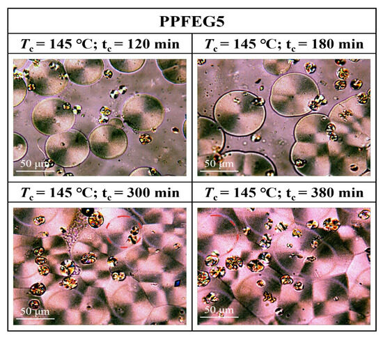 POM plots of PPFEG5 at 145 °C and different crystallization times.
