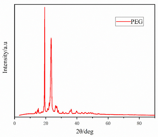 From Figure 14, it can be seen that the XRD curves of pure PEG contain two crystalline diffraction peaks with higher intensities, with the 2θ angles located at 19.32 and 23.5°, respectively, and in addition, there are also crystalline diffraction peaks with lower intensities in the range of 2θ = 10~60° at 15.28°, 26.22°, 27.12°, 31.02°, 36.46, and 39.72° for PEG.