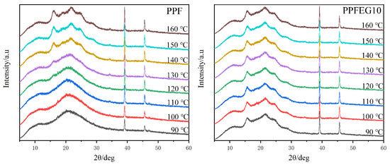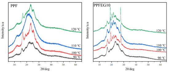 As you can see from Figure 16, the XRD pattern of PPF at Tc = 90 °C had four main diffraction peaks located at 2θ = 11.8, 21.7, 39.1, and 45.7°. As the temperature slowly increased, new diffraction peaks appeared at 16.1, 18.9, 24.8, and 28.6°. The XRD pattern of PPF at Tc = 140 °C has eight major diffraction peaks at 2θ = 11.8, 16.1, 18.9, 21.7, 24.8, 28.6, 39.1, and 45.7°. No other new diffraction peaks appeared as the temperature was increased. This may be due to crystallization at low temperatures resulting in a single crystalline form (β-form), whereas at higher temperatures, two different crystalline forms grow and coexist in the purified PPF. The XRD pattern of PPFEG10 at Tc = 140 °C had seven major diffraction peaks located at 2θ = 11.8, 15.6, 21.7, 24.8, 28.6, 39.1, and 45.7°. However, as the temperature increased, no new diffraction peaks appeared, probably because the addition of PEG induced the crystallization of PPF, resulting in the growth and coexistence of two different crystal forms, even at lower temperatures.