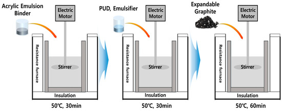 In order to manufacture a paint material with excellent flame retardancy and fire stability using non-halogen-based materials, the addition of expanded graphite is essential. Since the physical properties and thermal stability of the paint material change greatly depending on the mass fraction of expanded graphite, the mass fraction of expanded graphite is a very important factor in manufactured non-halogen-based paints [14,15,16,17]. Acrylic resin has excellent heat resistance and excellent wear resistance. Additionally, because the drying time is short, the work can be completed quickly. When mixing expanded graphite with acrylic resin, performance such as fire prevention performance, wear resistance, and heat resistance can be secured.