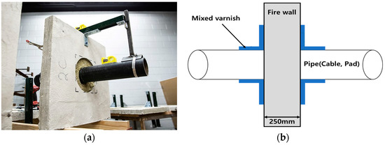 Firewalls, which are commonly found in large-scale buildings, must be constructed to be fireproof. In this study, we attempted to simulate fire stability in the “firewall penetration part” with and without mixed paint materials. A 3D model was created by applying data from the mixed paint material with the best thermal properties. The actual appearance of the penetration part of the firewall and a simple model for fire simulation are shown in Figure 2.