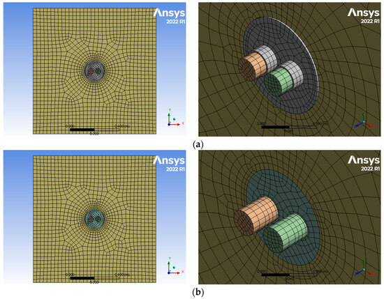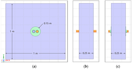 First, we attempted to implement the penetration part of the firewall as a 3D model in a virtual space. For 3D modeling, ANSYS (ANSYS 2022, Seattle, WA, USA), a commercial finite element analysis program, was used. A penetration part with a diameter of 150 mm was implemented in a firewall measuring 1 m × 1 m × 0.25 m. Inside the penetrating part are copper cables and PVC cables with a diameter of 40 mm, and the remaining space is occupied by urethane pads. The fire model for the firewall penetration area is shown in Figure 3. The penetration part of the firewall may have foreign substances or other dust on the surface. Because fire simulation depending on the presence or absence of mixed paint is important, it was assumed that other foreign substances did not exist in the penetration part of the firewall.